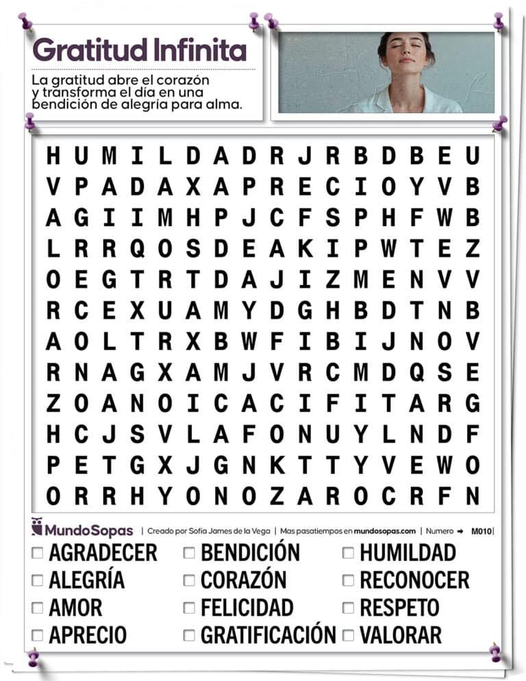 Una sopa de letras para imprimir gratis que garantiza la diversión para mayores con gratitud infinita incluida.
