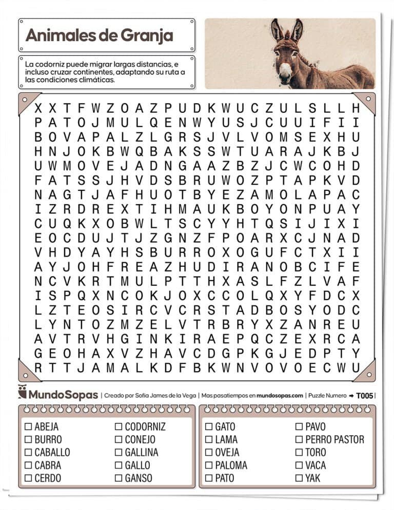 Esta sopa de letras de animales de la granja incluye palabras como burro, oveja, llama y gallina.