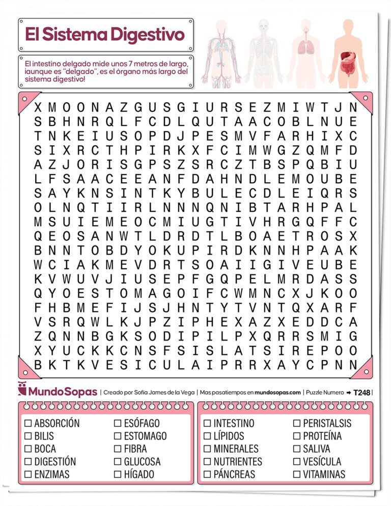 Encontrarás 20 palabras como estómago, intestino, esófago y más órganos del sistema digestivo.