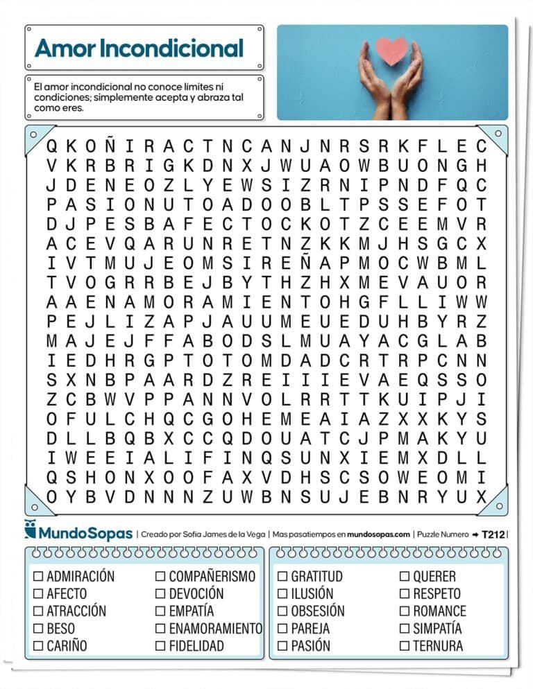 Una sopa de letras creativa para imprimir gratis llena de amor incondicional, sin discusiones ni corazones rotos.